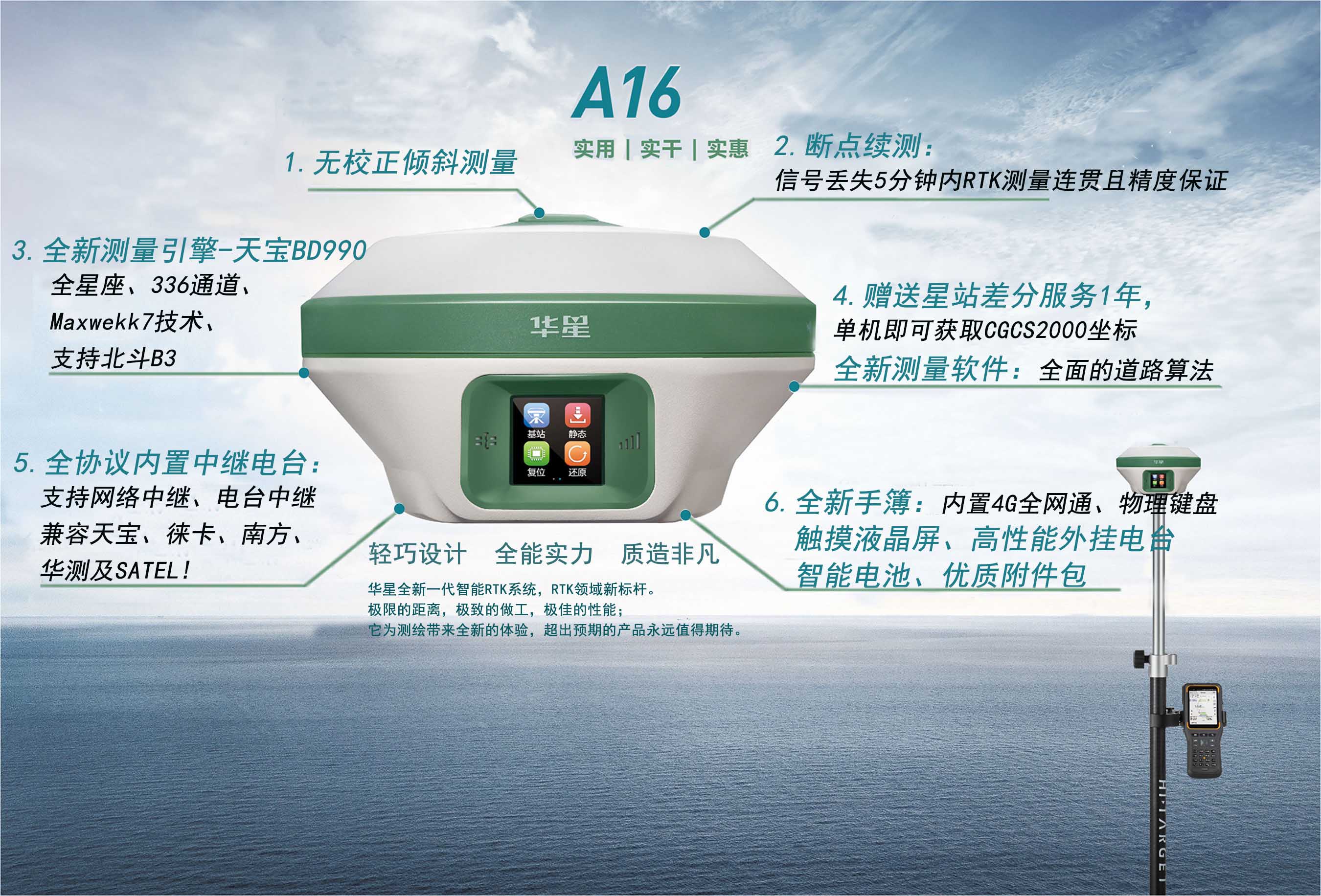◇ 新一代小型智能RTK,配新一代登录入口引擎BD990,提供智能测绘整体解决方案;